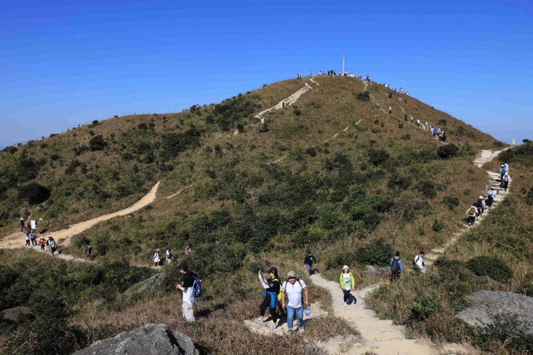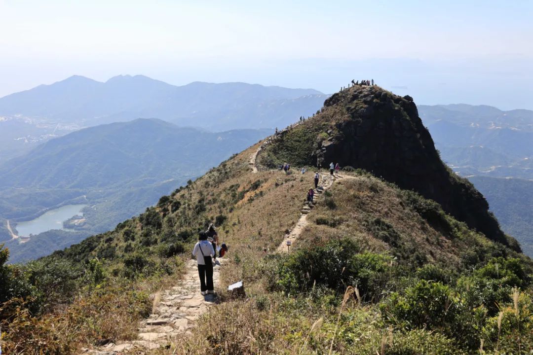 沿途的棧道、觀景平臺、涼亭、活動廣場等景觀節(jié)點(diǎn),充分利用原山石、林木、山澗、海洋等自然環(huán)境,成為了極佳的網(wǎng)紅拍照打卡點(diǎn)。頂峰三面環(huán)海,草甸遍布,可近觀火山熔巖痕跡,可遠(yuǎn)眺大雁頂、排牙山、大鵬灣、楊梅坑、東西涌、三門島、大小甲島等,超五星的270度無敵海景,隨手一拍,每一幀都是手機(jī)壁紙。